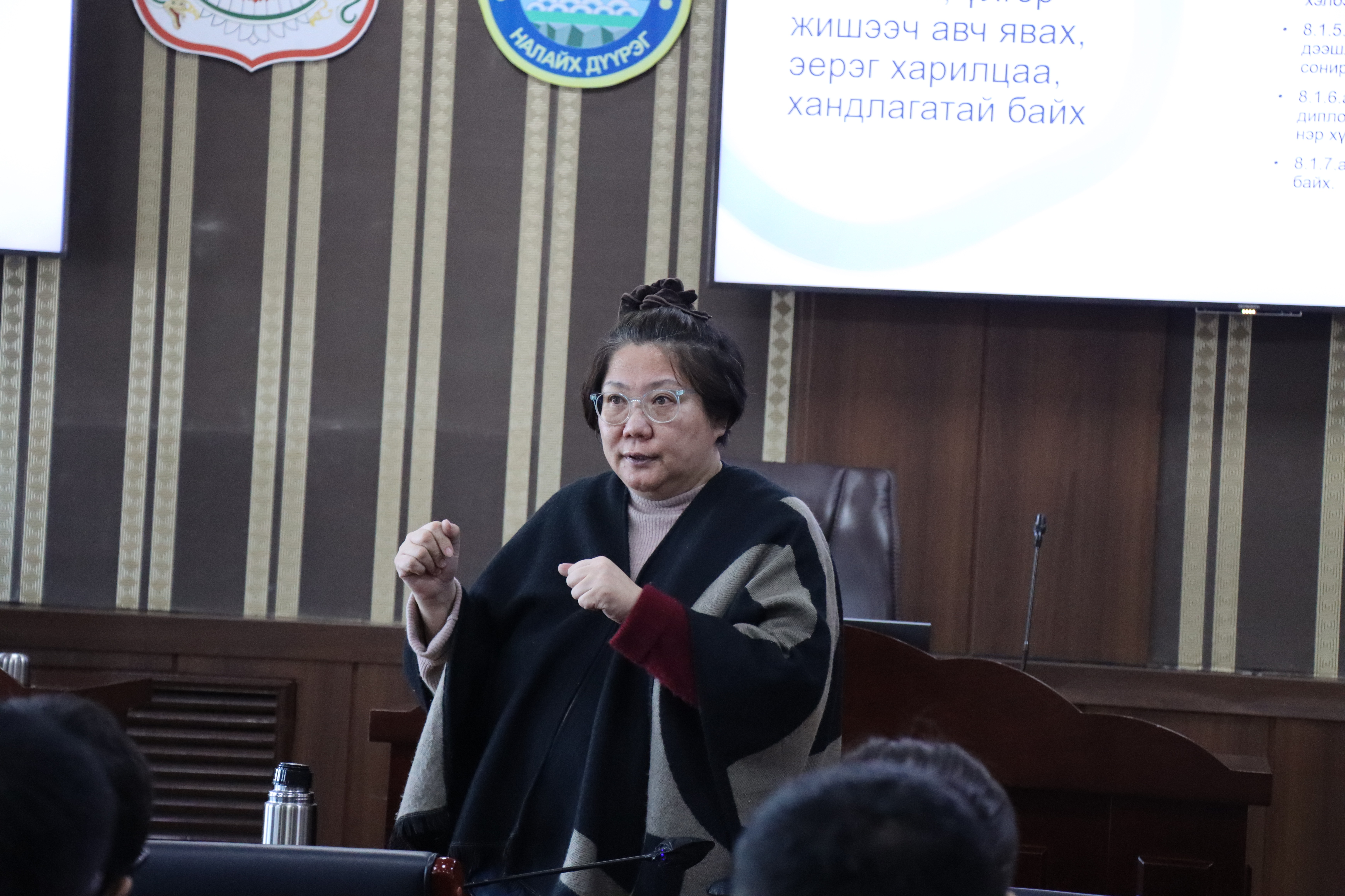 • Монгол Улсын бүсчилсэн хөгжлийн бодлого: Налайх, Багануур, Багахангай дүүргийн хөгжлийн бодлого, төлөвлөлт сэдвээр Бүсчилсэн хөгжлийн үндэсний хүрээлэнгийн Орон зайн өгөгдөл, судалгааны газрын ахлах мэргэжилтэн Б.Дэлгэрмаа бүс нутгийн хөгжлийн чиг хандлага, төлөвлөлтийн онцлог, орон нутгийн уялдаа холбооны талаар мэдээлэл өглөө.